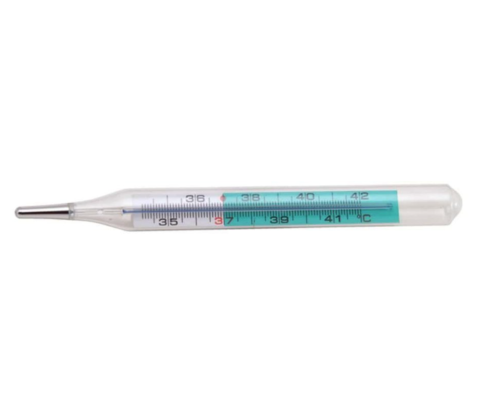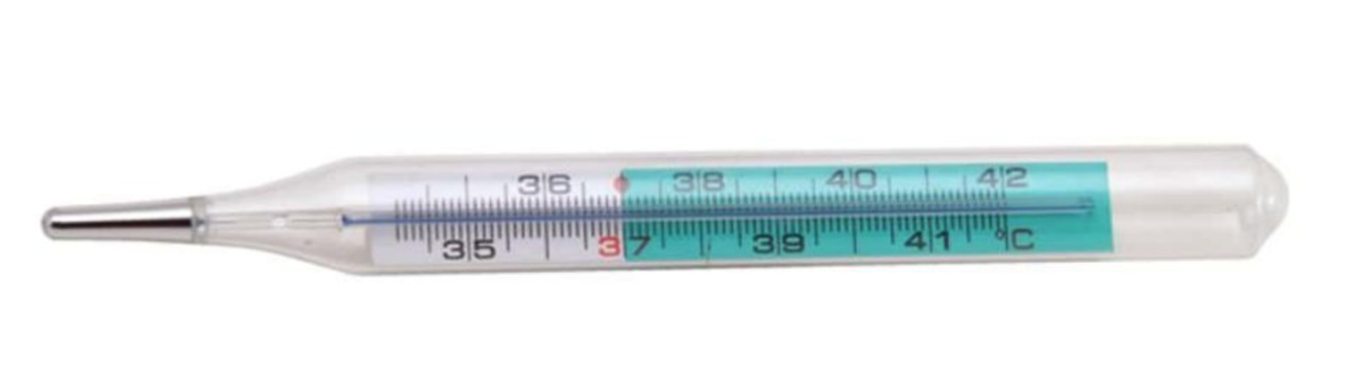 Bezortuťový lekársky teplomer s rozsahom merania 34 - 42°C.